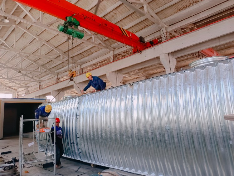 裝配式鋼結構蓄水池有效容積240m³。主體材料采用Q355合金鋼材質,結構形式200*55*3mm,寬2800mm,高2600mm;主體通過環(huán)向法蘭或環(huán)、縱向法蘭組合裝配成整體。裝配式鋼結構調蓄池裝配密封采用整體式單耳密封膠條,設置在環(huán)向法蘭或環(huán)、縱向法蘭連接面,通過大六角高強螺栓擰緊壓實密封。裝配式鋼結構調蓄池主體采用鍍鋅防腐處理。